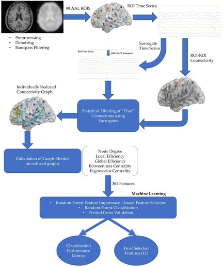 35] implemented in MATLAB was used for the calculation of all graph metrics. As suggested by BCT, betweenness centrality values were normalized by dividing them with (number of ROIs − 1) × (number of ROIs − 2). All the above network/graph metrics were combined in order to create the feature vector. The number of features in the initial feature vector were 361 (i.e., 4 metrics × 90 nodes plus a single global efficiency value) per subject.