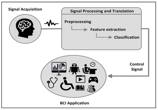 BCI systems are designed to translate brain activities into control commands using a device that stimulates brain activity, thereafter providing an assessment of neurological function or sensory feedback. Sensory feedback is recorded, decoded, and eventually translated into a measurable neurophysiological signal, effector action, or behavior. Basically, any BCI system can be described by traditional processing pipelines, which include the following processing stages [1]: