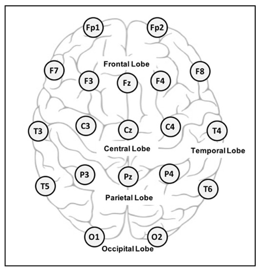 EEG largely captures electrical activity by means of electrodes placed at specific locations on the scalp [10], following the international 10–20 system depicted in Figure 2. The emotional state that EEG-based emotion detection systems are intended to recognize is usually defined according to the 2-D arousal–valence emotional model; this model, proposed by Russell (1980), can map discrete emotion labels into the arousal–valence coordinate system [3], as shown in Figure 3.