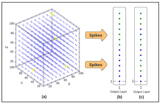 - The output layer classifier was classified with a modulation factor = 0.8 and drift value = 0.005. An architecture of the SNN cube trained using 60 samples is shown in Figure 6a, with the output layer when colored by true labels shown in Figure 6b, and when colored by predicted labels shown in Figure 6c.