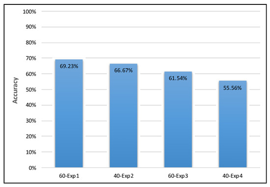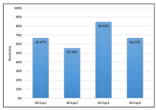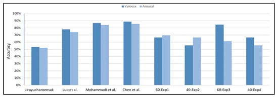 40-Exp4: A 40-sample EEG dataset was used to train and test the proposed system, obtaining an accuracy of 66.67% for valence classification and 55.56% for arousal classification. The accuracy of the low valence class was 0%, whereas that of the high valence class was 85.71%. Furthermore, the accuracy of the low arousal class was 60%, whereas that of the high arousal class was 50%. Figure 7 presents a comparison of the valence experiments’ results; Figure 8 presents a comparison of the arousal experiments’ results; and Table 3 presents a comparison of all the experiments in both dimensions.
