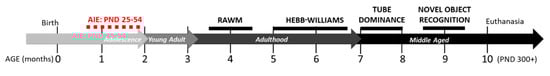 This pattern of alcohol intake is evident in both males and females, with almost 20% of male and female 12th graders having engaged in binge drinking in the last two weeks []. Previous preclinical studies have demonstrated that adolescent intermittent ethanol (AIE) exposure impacts performance in a variety of behavioral tasks, included inducing deficits in the Barnes and Morris water maze tasks [,,], novel object recognition (NOR) [], and social interaction tasks []. To expand on these results, the current study assessed the impact of AIE on learning and memory in male and female rats across a variety of cognitive domains, including spatial, non-spatial, and social domains, using both aversive and appetitive motivating factors, and working versus long-term memory components. Behavioral tests included the radial arm water maze (RAWM), Hebb-Williams maze, tube dominance test, and novel object recognition test, respectively. These tests were performed starting more than a month after the end of adolescent alcohol exposure and continuing across adulthood and into middle age with the aim to assess the longitudinal nature of cognitive-behavioral deficits after AIE.