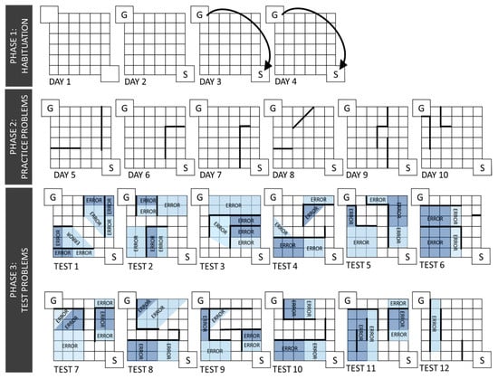 Hebb-Williams maze configurations. The above maze configuration and testing procedures were adapted from Rabinovitch and Rosvold []. Testing consisted of three phases: habituation, practice, and test. During the habituation phase, rats were acclimated to the testing apparatus and trained to run from the start box (S) to the goal box (G). Then, rats went through 6 different practice problems, followed by 8 runs each of 12 test problems. Each test problem has error zones, and an error was scored when the rat entered the incorrect zone, as determined by a blind observer. Each problem varied in difficulty level so that easy and difficult problems were dispersed throughout the testing paradigm.
