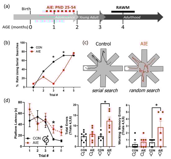 Adolescent intermittent ethanol (AIE) impairs problem-solving flexibility in the radial arm water maze (RAWM). (a) Timeline of RAWM paradigm. Rats underwent AIE or control gavage paradigms from PND 25–54. The RAWM was conducted later in adulthood (around 4 months of age). (b) Serial versus random search strategies were determined by a blind observer, as described in the methods. Controls increased employment of serial search strategies immediately after the first trial and increasingly employed serial searches on subsequent trials. AIE rats predominantly used random search strategies until trial three (males) and trial four (females), suggesting deficits in problem-solving strategy flexibility. (c) On the left is an example of typical run from a control rat using a serial search strategy (trial 5). On the right is an example run from an AIE rat using a random search strategy (trial 5). (d) AIE rats took longer to find the platform on the fourth and fifth runs of the first test day, suggesting a mild deficit in spatial learning. This effect is predominantly driven by an increase in the number of total errors made by AIE females. In addition, females tended to make more reference errors, suggesting deficits in working memory may be contributing to these results. Results are expressed as mean ± SEM. * p < 0.05.