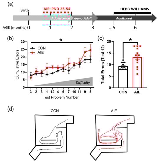 AIE increases errors in the Hebb-Williams maze battery. (a) Timeline of Hebb–Williams testing paradigm. Rats underwent AIE or CON gavage paradigms from PND 25–54. The Hebb-Williams maze was conducted later in adulthood (5–6 months of age). Males were tested first, followed by females. (b) As shown, tests were ranked by difficulty. In general, AIE increased errors in the Hebb-Williams maze, with greater divergence evident with increasing difficulty. (c) An example distribution of the number of errors rats made on test 12. AIE significantly increased the number of cumulative errors across the eight trials. (d) Example runs taken from test 12 for control (left) and AIE (right). Controls, on average, did not repeat errors, unlike AIE rats, which perseverated on the same incorrect turns. Results are expressed as mean ± SEM. * p < 0.05.