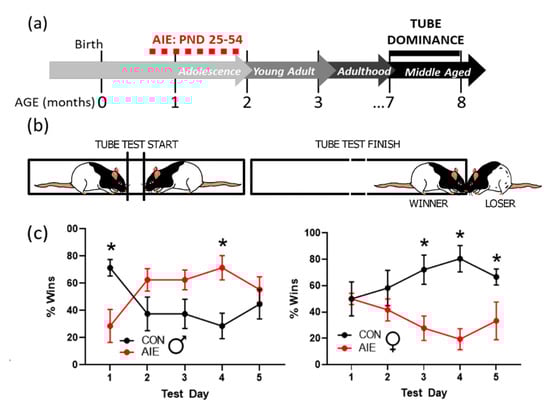 AIE increases submissive responses in the tube dominance test. (a) Timeline of tube dominance testing paradigm. Rats underwent AIE or CON gavage paradigms from PND 25–54. The tube dominance test was conducted later in adulthood (7–8 months of age). Males were tested first, followed by females. (b) Rats were placed on either side of a clear plexiglass tube and separated by removable gates. The test began when both rats were waiting at the gates, and the gates were removed. The test ended when one rat pushed the other out of the tube. Winning was scored as a binary win-lose. (c) Male rats exposed to AIE were more submissive on the initial test day, although this effect was transient where AIE males were more likely to win encounters by the fourth test day. In contrast, female rats exposed to AIE were increasingly more submissive with each test. Results are expressed as mean ± SEM. * p < 0.05.