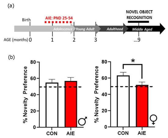 AIE impairs novel object recognition (NOR) in middle age female rats. (a) Timeline for NOR. Rats underwent AIE or CON gavage paradigms from PND 25–54. The NOR test was conducted later in adulthood (9 months of age). Males were tested first, followed by females. (b) Even in middle age, female rats that were exposed to AIE more than 7 months prior continue to show cognitive deficits, as evidenced by lack of discrimination in the percentage of time spent between novel and familiar objects. Results are expressed as mean ± SEM. * p < 0.05.