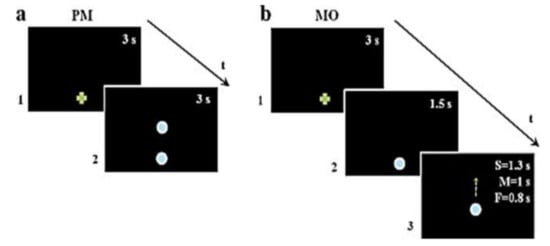Sequence of visual stimuli. (a) In the pointing movement experiment (PM), a green cross appeared on the screen to indicate the starting point. After 3 s, the green cross disappeared and two vertically aligned light blue dots (3.2 cm in diameter with a 51 cm gap between them) were displayed for 3 s. (b) In the movement observation experiment (MO), a green cross was displayed to indicate the movement’s starting point. After 3 s, the green cross was replaced by a light blue dot (3.2 cm in diameter). The dot remained at this position for 1.5 s and then started to move vertically upwards for a total of 51 cm of displacement on the screen with three different speeds.