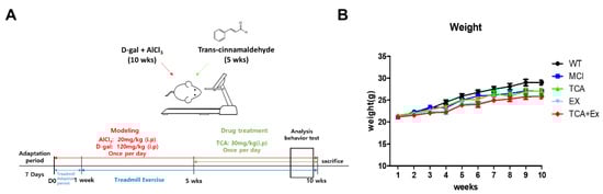 Experimental design and weight variation. (A) Schedule of the experiment. Eight-week-old C57Bl/6 mice were injected intraperitoneally with d-gal (120 mg/kg/day) and AlCl3 (20 mg/kg/day) for 10 weeks. Trans-cinnamaldehyde (TCA) (30 mg/kg/day) was injected intraperitoneally for 5 weeks. Treadmill exercise lasted 9 weeks and was initiated after 1 week of adaptation. Mice were euthanized and brain samples were collected for further analysis after the Morris water maze (MWM). (B) Ten weeks of d-gal and AlCl3 treatment induced cognitive impairment, and 5 weeks of TCA treatment and 9 weeks of treadmill exercise yielded no significant differences in weight among the groups. WT; wild-type control group, MCI; mild Cognitive impairment group, TCA; MCI group fed TCA, EX; MCI group that performed treadmill exercise. TCA+EX; MCI group that performed treadmill exercise and was fed TCA.