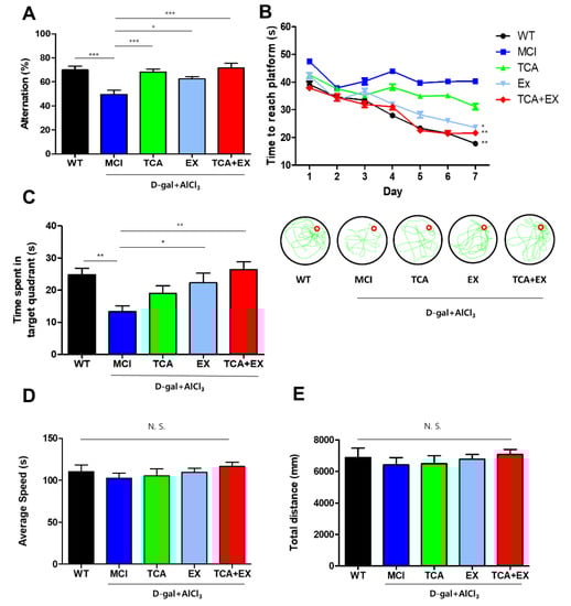 Exercise and TCA improved cognitive function in mice with d-gal- and AlCl3-induced cognitive deficiencies. (A) Spontaneous alternation scores in the Y-maze task. The occurrences of correct alternations are expressed as a percentage the total alternations (mean + standard error of the mean (SEM); n = 12 per group). (B) Spatial learning and memory of mice were analyzed by the time to reach platform for 7 days on the MWM. To analyze cognitive function, we measured the time required to reach the platform. (C) After 7 days, a probe task was performed. The amount of time that the mouse spent in the target quadrant was measured during 60 s probe test. To accurate analysis of memory, the average swim speed (D) and total distance traveled (E) were identified in the probe test. All results are expressed as the mean ± SEM; n = 12 per group). N.S.; no significant. * p < 0.05 compared with the MCI group; ** p < 0.01 compared with the MCI group; *** p < 0.001 compared with the MCI group. WT; wild-type control group, MCI; mild cognitive impairment group, TCA; MCI group fed TCA, EX; MCI group that performed treadmill exercise. TCA+EX; MCI group that performed treadmill exercise and was fed TCA.