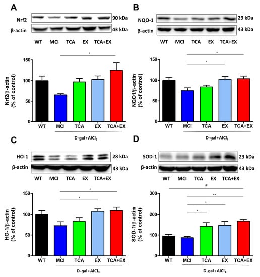 Effects of TCA and treadmill exercise on the Nrf2 signaling pathway in the brains of d-gal- and AlCl3-treated mice. (A–D) Representative immunoblot images and quantification of proteins related to the Nrf2 signaling pathway. Immunoblotting was carried out using antibodies against Nrf2 (A), NQO1 (B), HO-1 (C), and SOD-1 (D) on total protein lysates from the brain. All results are expressed as the mean ± SEM; n = 5–6 per group). * p < 0.05 compared with the MCI group; ** p < 0.01 compared with the MCI group; # p < 0.01 compared with the WT group. WT; wild-type control group, MCI; mild cognitive impairment group, TCA; MCI group fed TCA, EX; MCI group that performed treadmill exercise. TCA+EX; MCI group that performed treadmill exercise and was fed TCA.