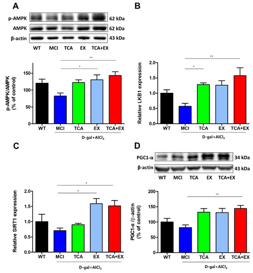 Effects of TCA and treadmill exercise on LKB1/AMPK and SIRT1/PGC-1α expression in d-gal- and AlCl3-treated mice. (A) Representative immunoblot images and quantification of the AMPK (A) and PGC-1α proteins (D). mRNA expression levels of LKB1 (B) and SIRT1 (C). All results are expressed as the mean ± SEM; n = 5–6 per group). * p < 0.05 compared with the MCI group; ** p < 0.01 compared with the MCI group. WT; wild-type control group, MCI; mild cognitive impairment group, TCA; MCI group fed TCA, EX; MCI group that performed treadmill exercise. TCA+EX; MCI group that performed treadmill exercise and was fed TCA.