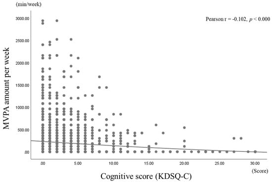 Figure 1 shows the correlation coefficients between KDSQ-C scores and weekly MVPA amounts. As shown, a negative correlation was found between KDSQ-C scores and weekly MVPA amounts (p < 0.000).