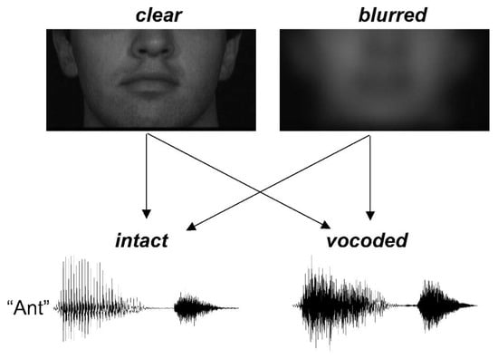 - Grant, K.W.; Seitz, P.-F. The use of visible speech cues for improving auditory detection of spoken sentences. J. Acoust. Soc. Am. 2000, 108, 1197. [Google Scholar] [CrossRef]