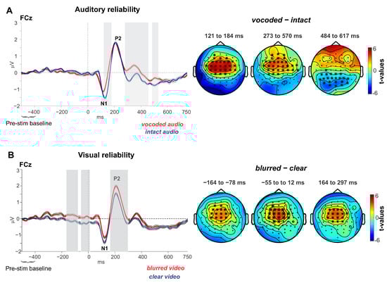 ERP waveforms and t-value topographies distinguishing Auditory reliability conditions (A) and visual reliability conditions (B). Grey shaded areas indicate significant time windows distinguishing the two conditions at channel FCz. Ribbons around the waveforms indicate within-subject standard errors. Waveforms were baselined to the −500 to −400 ms pre-acoustic onset period.