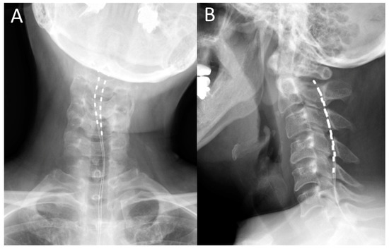 Postoperative cervical X-ray images following spinal cord stimulation. (A) Anteroposterior and (B) lateral view.