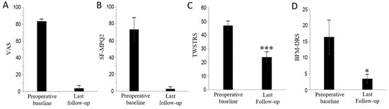 With respect to the four clinical assessments (TWSTRS and BFDRS), the Student’s t-test following Shapiro–Wilk normality test was employed to assess the statistical significance between preoperative baseline and the last follow-up. All values were expressed as means ± S.D. p-Values of less than 0.05 were considered to be statistically significant.