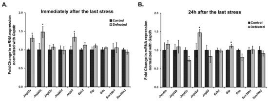 We quantified the mRNA expression levels of a few of the Jumonji C domain-containing lysine demethylases (Jmjds) and few lysine-specific methylases, in the DG of the defeated mice, sacrificed at 0 h (10th day) and 24 h (11th day) after the last stress event. Interestingly, we observed a highly dynamic expression pattern of Jmjds in both the conditions. Defeated mice, which were sacrificed 0 h after the last defeat episode, showed a significantly higher mRNA expression of Jmjd2a, Jmjd2b, and Jmjd3 in their DG as compared to the controls (p < 0.05). The mRNA expression level for other Jmjd2 family members and the methyltransferases was not altered (Figure 3A). On the other hand, when mRNA expression of these genes was analysed in DG samples of the mice sacrificed on the 11th day, we observed a different profile of these demethylases, where defeated mice displayed significantly higher levels of Jmjd2d and reduced levels of Jmjd2c as compared to the controls (p < 0.05). Additionally, one of the H3K9 methyltransferases, Glp also exhibited significantly increased mRNA expression in the defeated mice (p < 0.05). The other methylation regulators did not show any change in their expression (Figure 3B).
