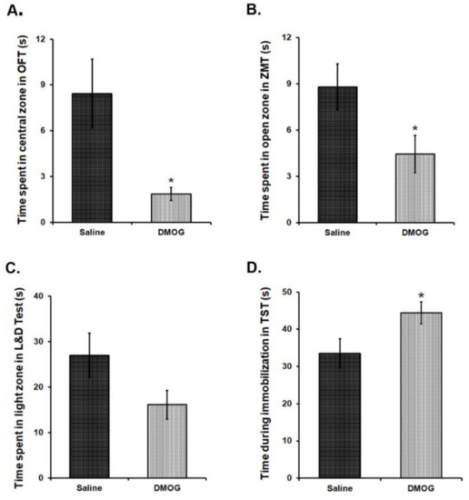 3.8. Administration of DMOG Induces Anxiety-Like and Depression-Like Phenotype in Mice without Any Exposure to Stress
