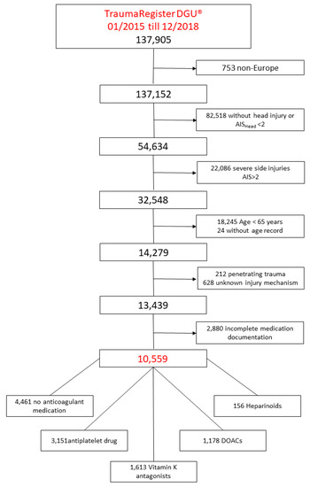 Statistical analyses were performed using SPSS statistical software (SPSS Version 24, IBM Inc., Armonk, NY, USA). Data were presented as mean with standard deviation (±SD) and as percentages for categorical variables. Multivariable logistic regression analysis with a severe TBI (AIS 4/5/6) as the dependent variable was performed to estimate the impact of coagulation medication intake on the severity of the TBI (measured by the AIS). Therefore, the multivariable logistic regression model was adjusted for the potential confounders type of accident, age, gender, ASA score, and additional injuries in other body regions. Odds ratios (OR) are presented with their respective 95% confidence interval (CI). Due to multiple comparisons, formal statistical testing was avoided, and statistical significance was mentioned only in selected situations. The level of significance was set at p < 0.05.
