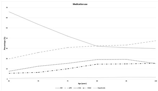 With increasing age, the percentage of patients using antithrombotic medication increased from 34.1% at the age of 65–69 years to 70.1% in patients older than 90 years. The highest increase was observed in the APD group, where the percentage increased from 19.9 to 37.5% (Figure 2).