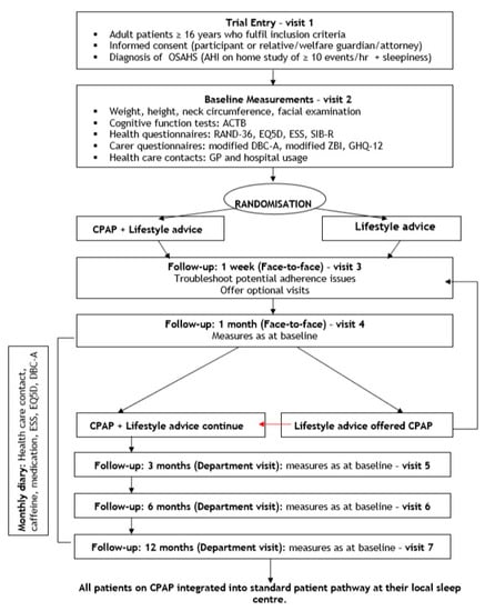 Participants and relatives/carers were asked to fill out a diary during the 12-month period. This was used to record GP and hospital visits, caffeine intake, medication and CPAP side-effects. All questionnaires were filled in at each visit by participants assisted by a relative/carer as appropriate to allow for objective evaluation. The same individual was required to fill in the questionnaires throughout the study to maintain internal consistency.