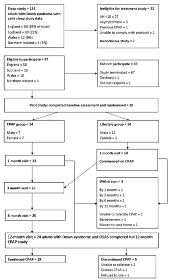 Continuous positive airway pressure (CPAP) therapy is the gold-standard treatment for moderate-severe OSAS in adults, and is effective in ameliorating OSAS consequences, including excessive daytime, cognitive dysfunction and metabolic and cardiovascular outcomes in the general population although the data are not always consistent [9,10,11,12]. CPAP use has been shown to reduce the risk of all-cause mortality to a similar level as the general, non-OSAS, population [13]. However, despite the potential benefits, diagnosis and treatment of OSAS in adults with Down syndrome is not commonplace, and, to date, no objective studies of CPAP effectiveness in the Down syndrome population have been published. This study aimed to assess the effectiveness and acceptability of CPAP in adults with Down syndrome and OSAS living in the UK, with reference to subjective sleepiness, behavioural and emotional function, cognitive function, and general health.