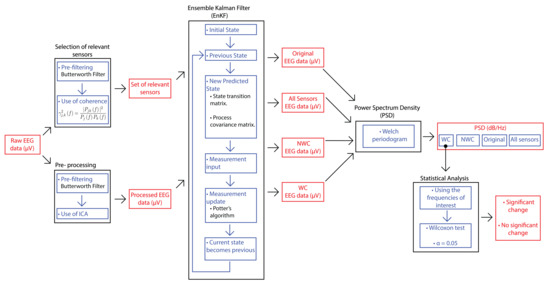 An overview of the methodology proposed in this paper is shown in Figure 1. The first step is based on the coherence-based method proposed in [18], in which the EEG data was used for selecting sensors that provide the most relevant information for the brain task of interest. Since the coherence expresses the correlation between two signals in the frequency domain, it gives an idea of the interconnection level that two different brain areas had. Moreover, the signal is filtered with a bandpass and independent component analysis (ICA) for eliminating artifacts. With the relevant sensors and the filtered signal, the EnKF is applied. For this, a Python program was developed with different libraries like Numpy. The main reason for using this programming language along with these libraries is two-fold: the reduction of computer memory for storage and the easier manipulation of matrix structures since Numpy is implemented in C. Hence, matrix operations are faster to compute [19]. Our Python implementation is freely available in [20]. The program returns the original signal and the output of applying EnKF in three scenarios: considering all the electrodes, considering the relevant ones (referred to as winner channels or WC), and not considering these electrodes (not winner channels or simply NWC). Then, the power spectrum density (PSD) is obtained from these outcomes. Finally, the Wilcoxon signed-rank test is computed with the PSD of the relevant sensors to find out if there was a significant change in the frequency range selected regarding the phenomenon of interest.