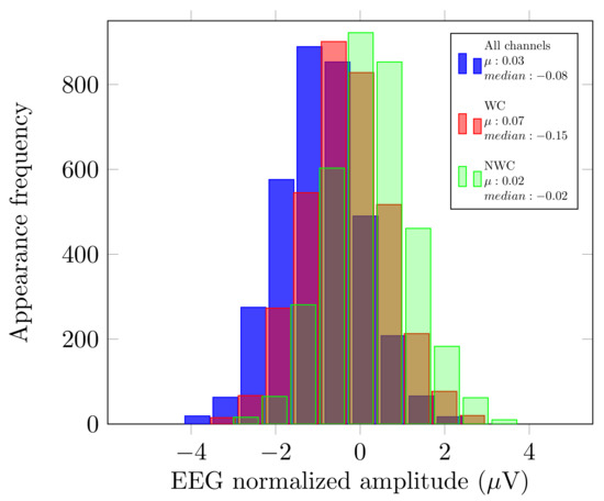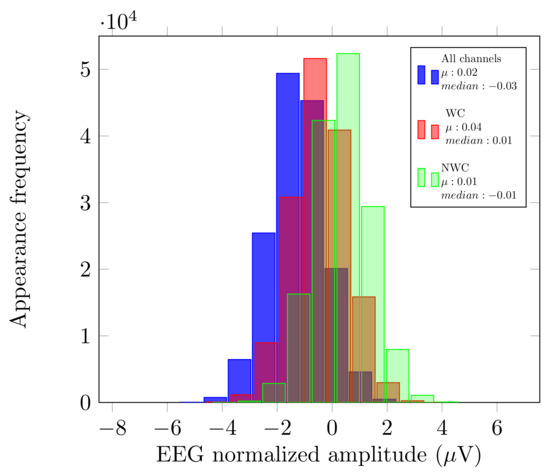As displayed in Figure 2, the and median of each of the histograms have very close values. With these variables, we can see that there was no bias if we considered fewer or more electrodes in our EEG analysis.