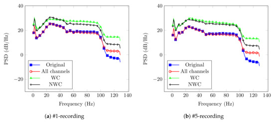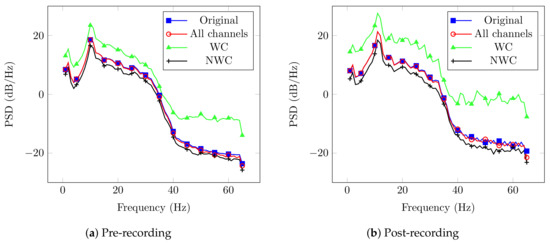 Again, the plot corresponding to WC stands out as the one with higher power for most of the frequencies; however, NWC curve is on top for some frequencies and not far away of WC. Such behavior could be related to different factors that affect the user’s performance and, in consequence, the power of certain frequency bands [46]. Nevertheless, this behavior could be related to the selection of the relevant sensors. As described in Section 2.2, the subsets needed to have a 100% appearance in all the frequency range in the brain recording so we could consider it as a candidate.