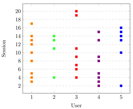 As described in Section 2.4, the statistical testing was performed to find significant changes for all users and sessions. Please note that the main goal of the Dataset was to study a possible increase in the IAPF’s spectrum with the concentration task. The statistical results can be seen in Figure 4, where the x-axis represents the users and the y-axis is each of the sessions recorded. There, the points represent in which sessions the participants had a significant increase in the alpha band. We note that all users had this performance in more than one session. This is an expected result since the alpha band is related to cognitive processes like concentration [41]. Moreover, we can appreciate that in consecutive sessions the participants had the significant increase, and then there is a range of sessions without a change. For example, User 1 had sessions 3, 4, and 5 highlighted, and she did not have another significant increase until session 8. As well, the participants have less than half of the sessions performed with a significant change. This behavior is discussed in detail in Section 4.