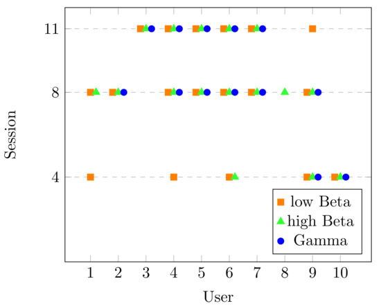 Please note that the main goal of this dataset was to study the spectrum behavior in different frequency bands during the process of learning a new skill. They reported a significant decrease in the PSD of beta (13–29 Hz) and gamma (30–40 Hz) bands. With this information, the corresponding statistical analysis for beta (low and high) and gamma bands was performed on selected channels and significant changes found are presented in Figure 7. Like in Figure 4, the x-axis presents the users of the dataset and the y-axis is every lesson recorded. Moreover, each point (according to each frequency band) displays where the users had the desirable performance. Please note that most of the users show significant changes in the beta band (either low, high, or both) in most of the lessons. This agrees with beta band being related to motor learning activities, as in the case of the typing task. The gamma band also had a significant change, which could be associated with temporal binding, which is the ability to group separate events occurring at different lapses of time [25].
