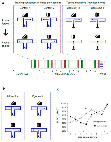 The standard T-maze design was modified in order to achieve higher dependence on allothetic, extra-maze cues and to promote the acquisition of behavioral strategy based on these cues. Opaque walls were replaced by transparent Plexiglas. A digital projector was used to display two distinct images of Nencki Institute interiors (Context A and Context B) in front of the maze. Both images were adjusted for equal overall brightness and RGB levels. The experimental design is summarized in Figure 1a. Each behavioral trial consisted of a forced run, with one arm blocked and the open arm rewarded, immediately followed by a choice run with both arms open but with reward only in previously unvisited arm (“win–shift” strategy). Each animal was subjected to 8 trials per day, with a 2 min inter-trial interval. On each day, only one context was used. Each context required a different sequence of turns during the forced and the choice phase. For CtxA (“stair”), the sequence was right/left, and for CtxB (“door”), it was reversed (left/right). Contexts were changed daily for 16 days. On days 1–8, one Cheerio loop was used as reward, and on days 9–16, half a loop was used. Each choice trial was scored as correct when the animal entered the correct arm and collected the food reward. Other cases were counted as incorrect, including trials where the animal entered an arm (as defined by crossing the entrance with the tail base) and withdrew before reaching the end. After each failed trial, the animal was immediately removed from the maze. During the test day, the animals were first subjected to four control trials (two in each context, alternating). For the strategy assessment, animals performed another four trials with the context changed during the choice phase. Both arms were rewarded during that phase in order to avoid memory extinction. Rats were classified into the “allocentric” or “egocentric” group on the basis of their performance during four test trials. The threshold was estimated based on the average probability of error in the last training block, where animals reached asymptotic performance (Figure 1c). In that block, the animals completed a total of 199/208 correct trials, and the frequency of error (lack of alternation between sample phase and choice phase) was 0.043. Under these assumptions, the following probabilities of alternations were calculated for the test session: 4/4, p = 0.839; 3/4, p = 0.15; 2/4, p = 0.01; 1/4, p = 0.0003; 0/4, p = 0.000003. The animals that performed two or less alternations in four test trials were therefore considered allocentric.