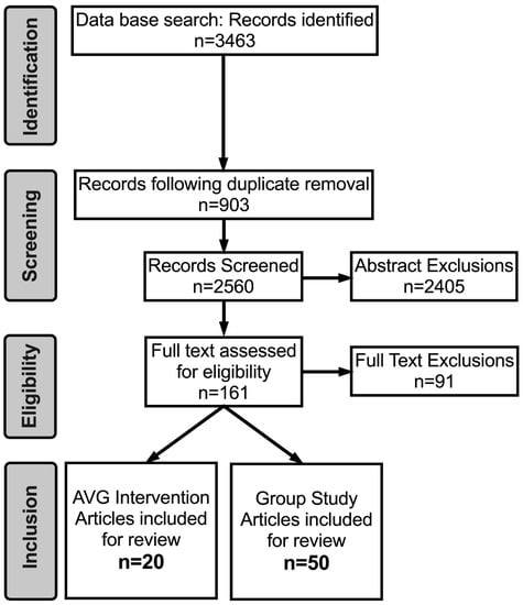 The remaining 161 articles were read and summarized based on the AVG intervention used and cognitive ability assessed. The most common reason for exclusion at this stage was that studies failed to use an AVG intervention or they failed to use a pre-post design.