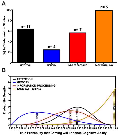This percentage provided an observed estimate of the success rate for an AVG intervention to improve a given cognitive ability, or, in the case of group studies, the success rate for a group study to demonstrate superior cognitive performance of AVGPs compared to NGs. However, the reliability of this success rate estimate can fluctuate based on the number of studies included in its calculation. In order to assess the confidence that a calculated success rate represents the true success rate, we also calculated the probability that the observed success rate represented the true success rate given the included studies. This metric allows for a more informed comparison of the estimated success rates among AVG intervention (or group) studies across the cognitive abilities, where the number of studies contributing to the success rate for each cognitive ability differ. We used a Bayesian approach to calculate this probability, p(A|Data), according to Equation (2), where p(A) represents the prior probability that the true success rate is a given value, p(Data|A) is the probability of observing the number of positive effects out of the number of total studies given the true success rate, and p(Data) is the probability of observing the number positive effects out of the total number of studies [].