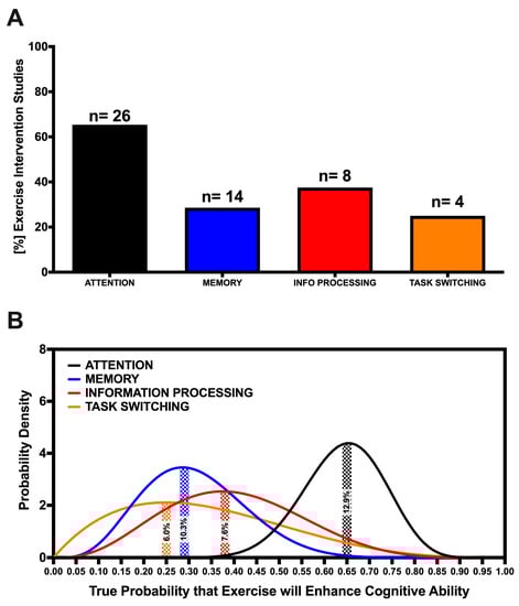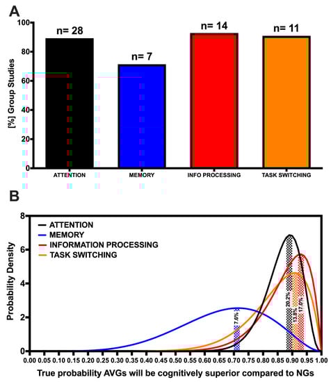 (A) Percent of included studies finding a positive effect of AVG play on attention, memory, information processing and task-switching cognitive abilities. ‘n’ values represent the total number of included studies examining each cognitive ability. (B) Probability density functions for the true success rates of a study to find attention (black trace), memory (blue), information processing and task-switching (orange) performance improvements following AVG play, respectively. Shaded areas represent the probability (/100%) that the observed success rate, given the findings of the included studies, reflects the true success rate.