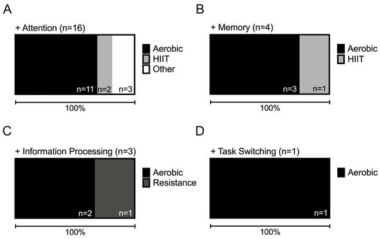 Exercise can be characterised based on a number of criteria, including whether it is aerobic or anaerobic, dynamic or static, blocked or varied. It is important to consider these characteristics as evidence suggests that cognition is differentially affected by various exercise features. For instance, Ref. [] demonstrated that acute aerobic exercise can significantly improve reaction time during a working memory task, whereas no such effects were observed after resistance exercise. Additionally, Ref. [] reported low intensity exercise led to a significant increase in resting state functional connectivity (rs-FC) in the left and right Frontoparietal Network (FPN), while rs-FC decreased in the Somatosensory Network and the Dorsal Attention Network after high intensity exercise. These results suggest that transient persistent network alterations after exercise can be differentially moderated by varying exercise intensity. Such studies exemplify how exercise type and intensity can influence exercise’s effect on cognitive ability and how this information may be significant for developing tailored physical exercise programmes for cognitively driven sports [].