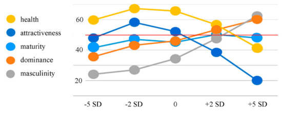 Pearson’s correlations revealed a highly significant positive correlation between BFP and dominance ratings (r = 0.579; p = < 0.001), a significant positive correlation between BFP and maturity ratings (r = 0.171; p = 0.015), a highly significant positive correlation between BFP and masculinity ratings (r = 0.679; p < 0.001), a highly significant negative correlation between BFP and health ratings (r = −0.370; p < 0.001), and a highly significant negative correlation between BFP and attractiveness ratings (r = −0.575; p < 0.001). A false discovery rate correction calculation following the Benjamini–Hochberg procedure [36] revealed that no false positive results occurred.