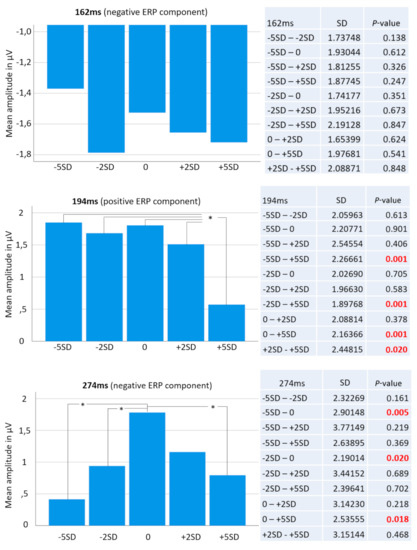 The top bar diagram shows mean ERP amplitudes at 162 ms post stimulus across all five face categories. Right o it is a table showing all possible pairs of mean amplitude comparisons including respective t-test results. No significant differences were found between any possible pairs of mean amplitude at this time point, which is known as the face-specific N170 ERP component. The middle bar diagram shows mean ERP amplitudes at 194 ms post stimulus across all five face categories. The table on the right shows all possible pairs of mean amplitude comparisons including respective t-test results. Strikingly, the +5SD face category (thickest face) was significantly different from all other categories. Finally, the bottom bar diagram shows mean ERP amplitudes at 274 ms post stimulus across all five face categories and right o it is a table showing all possible pairs of mean amplitude comparisons including respective t-test results. Here, the “normal” or “standard” face turned out to elicit significantly different brain activity from the −5SD, the −2SD and the +5SD face categories. Significant comparisons are marked with an asterisk (*) in the bar diagrams.