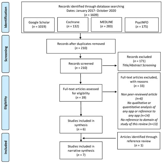 From Figure 1, after removal of duplicates,  records were identified in the identification phase. Next, the titles and abstracts screening of these 210 selected records for eligibility resulted in the feasibility of  records for further evaluation. The full-texts of the selected 39 records were then assessed for further suitability, resulting in a rejection of additional 32 records, due to several reasons: 5 out of the 32 records were not subjected to a peer-review process, 14 records did not perform any qualitative or quantitative analysis of the respective app, or did not reference any app and 13 records did not show any meaningful overlap with the content, aim and scope of this review. The review selection process yielded a total of  records, whereas 1 additional article was added through a manual review of references, the total number of included records was therefore .