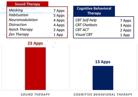 Different treatment modalities for management of tinnitus symptoms exist, for instance, tinnitus retaining and sound therapy, tinnitus masking, conventional drug delivery, and even brain stimulation—among them, tinnitus retaining therapy, tinnitus masking, or sound therapy using sound generators and CBT as counseling, are standard treatment procedures []. Most of the tinnitus relief apps that are generally published on app markets offer tinnitus masking, or sound therapies using different sound techniques like acoustic neuromodulation, notched sound, or amplitude modulation. Importantly, it is significant to note that the smartphones are capable of delivering acoustic and sound therapy reliably and accurately [].
