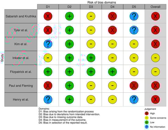 The Figure 3 shows the results of risk of bias assessment for individual studies with the help of a traffic light plot, while the summary plot for risk of bias assessment results is depicted in Figure 4. Both plots were generated using the robvis tool []. Based on the outcomes of the over-all assessment (Figure 3), only 2 out of 7 studies [,] had ‘Some concerns’ of bias, while the rest of the 5 studies had ‘High risk’ of bias. Please note that since it is almost impossible to conceal the type of intervention from patients and healthcare providers in case of mhealth interventions, the domain ‘D2: Biases due to deviations from intended interventions’ was assessed at ‘Low risk’ for all identified studies (Figure 4).