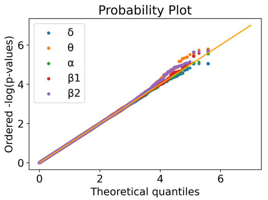 Quantile–quantile plot for the five linear regressions. Ordered quantiles of the log-transformed p-values for each of the five linear regressions (δ: blue; θ: yellow; α: green; β1: red; β2: purple) by the theoretical quantiles. A uniform distribution of p-values should follow the 45° line in orange.