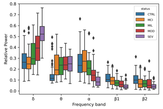 An ANOVA test was computed to evaluate the capacity of the EEG signals for distinguishing between LOAD patients in the different disease stages, subjects with MCI, and controls with normal ageing. RP values distinguished between healthy and affected individuals with statistical confidence, in particular with p-values ranging between 1.42 × 10−7 and 1.02 × 10−3 (Figure 2). This pattern has been observed before in other AD cohorts: an increase in the relative power of slow oscillations (δ and θ rhythms) and a decrease in relative power of fast oscillations (α and β rhythms) [36].