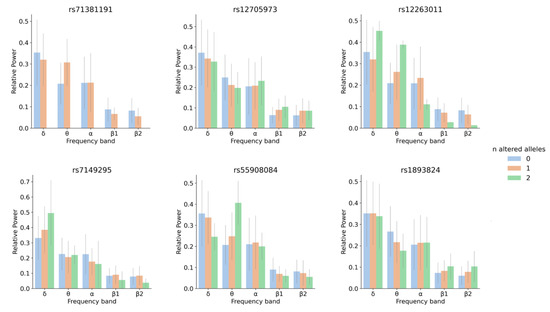 Relative power for each frequency band and genotype for rs71381191, rs12705973, rs12263011, rs7149295, rs55908084 and rs1893824. The number of altered alleles is color coded: blue for individuals with 0 altered alleles (homozygous for the most frequent allele), orange for heterozygous individuals and green for individuals homozygous for the altered (minor) allele.