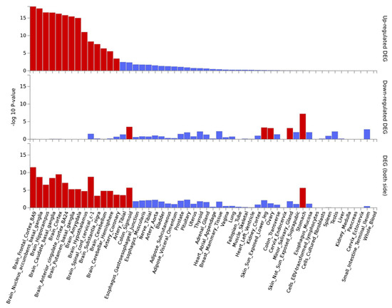 Significantly enriched DEG (differentially expressed genes) for the 50 top genes on GTEx v8 54 tissue types. Log-transformed p-values for the enrichment of DEG in each tissue. Significantly enriched tissues are displayed in red (adjusted p-value ≤ 0.05), otherwise in blue. The tissues are ordered by their enrichment’s significance on up-regulated genes, and the graph also displays values for down-regulated genes as well as up/down-regulated.