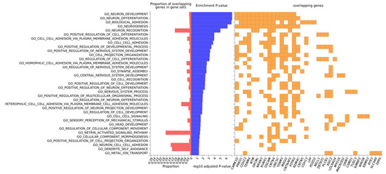 Gene-ontology (GO) analysis on this set of 50 genes retrieved “Neuron development” and “neuron differentiation” as the topmost enriched categories, and included the following genes: CAMK1D, PRKG1, CDH23, TENM4, NTM, OPCML, NRXN3, RUNX1, DSCAM, CNTN4, UNCSC, TENM3, MAGI2, CNTNAP2, PTPRD and KDM4C (neuron differentiation) (Figure 5). All the other significantly enriched categories are related to neuron or head development. By the same token, GO term enrichment for cellular component analysis revealed significantly enriched categories related to neuron parts (Figure S9). As expected, in this set of genes, there is an overrepresentation of associations with brain phenotypes and neurological pathologies such as: chronotype, schizophrenia, Asperger syndrome, brain connectivity, short-term memory, dimensional psychopathology, bipolar disorder and AD (Table 4).