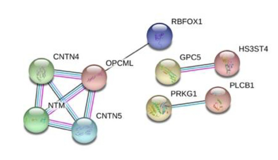 Finally, we performed a protein interaction analysis with STRING for the top 50 protein-coding genes that resulted in a network with significantly more interactions than expected and an enrichment p-value = 2.35 × 10−6 (Figure 6). Some of the interactions in the network, deserve a closer look. CNTN4 (Contactin-4), mediates cell surface interactions during nervous system development and in conjunction with one of its binding partners, amyloid precursor protein (APP), has been shown to promote target-specific axon arborization, highlighting its importance for the functional development of a behaviorally-relevant parallel visual pathway [49]. CNTN5 (Contactin-5) is a similar molecule but it is exclusively expressed in the central nervous system (CNS), with strong expression in the cortex and hippocampus, and has been associated with ASD [50]. NTM (neurotrimin) is a neural cell adhesion molecule of the immunoglobulin superfamily that appears to regulate the development of neuronal projections and might have a role in mediating estrogen-induced peripheral sympathetic innervation; Ntm-deficient mice have shown a deficit in emotional learning [51,52]. RBFOX1 (RNA binding protein fox-1) regulates alternative splicing in tissue-specific exons, and its cytoplasmic target mRNAs are enriched in genes involved in cortical development and autism [53].