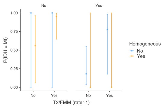 Accordingly, the highest probabilities of distinguishing between mutant and wild-type IDH variants with the use of MRI were achieved when considering the T2–FLAIR mismatch sign. The probability of being IDH mutant in the presence of the T2–FLAIR mismatch sign was as high as 92.9% (95% CI 63–99%). On the contrary, the probability of being Mt in the absence of the T2–FLAIR mismatch sign dropped to 20% (95% CI 5.04–54.1%). It was only the co-registration of the contrast enhancement properties of the lesion that improved our discrimination between the two alleles. More specifically, the probability of being Mt in the presence of the T2–FLAIR mismatch sign and the absence of contrast enhancement was as high as 95.5% (95% CI 64.9–99.6%). Meanwhile, the probability of being IDH mutant in the absence of the T2–FLAIR mismatch sign along with contrast enhancement was as low as 16.2% (95% CI 3.4–51.3%). The predictive characteristics of the full model are visualized in Figure 2, while the results from all potential combinations are depicted in Table 5.