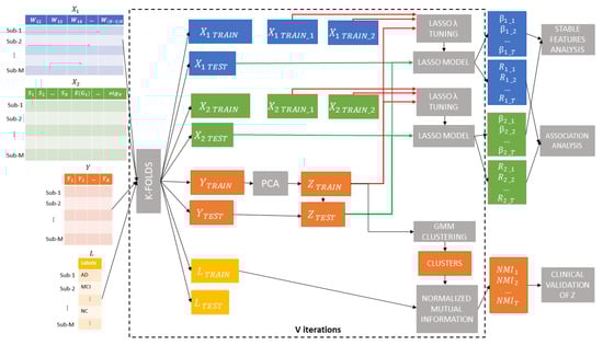 The main steps are shown in Figure 1. Briefly, re-sampling of a k-fold () cross-validation was executed, producing subsets of , and Y datasets. In each iteration, nine folds of the score matrix (i.e., ) were input to the first module to find a single generalized cognitive score from the ten clinical indices by means of principal component analysis (PCA). The new score was validated by using a clustering-based analysis in conjunction with the diagnosis labels for each subject provided in the ADNI Neuropsychological Battery table. Within each cross-validation round, we trained a Lasso regression model for each dataset and . We finally tested the two trained model on the left out fold and to predict and evaluate the most effective connectivity dataset. We also used the weights of the best Lasso models to identify the particular subset of features that yields the best performance by means of a stability analysis [46]. Each step of the framework is detailed in the next sections.